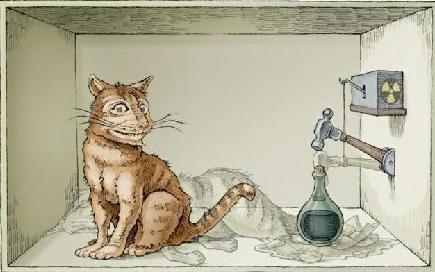 作为爱因斯坦的支持者,薛定谔提出了一个著名思想实验“薛定谔的猫”。实验设想将一只猫关在装有少量镭和氰化物的密闭容器里。镭的衰变存在几率,如果镭发生衰变,会触发机关打碎装有氰化物的瓶子,猫就会死;如果镭不发生衰变,猫就存活。根据量子力学理论,由于放射性的镭处于衰变和没有衰变两种状态的叠加,猫就处于死、活两种状态的叠加。也就是说,只要不去观察,这只猫就“又死又活”,这显然违背人们对世界的传统认知。薛定谔本想用这只猫来讽刺“哥本哈根学派的荒谬性”,然而让爱因斯坦和薛定谔都没有想到的是,后续的一系列物理实验基本都印证了哥本哈根学派的主张:宇宙在基本层面上,似乎真的具有某种内在的随机性。