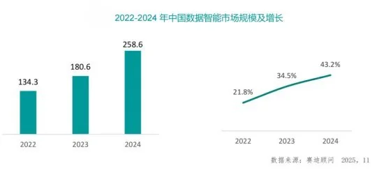 赛迪顾问在报告中指出,受益于AI技术突破性进展、数据量爆炸式增长及政企数智化转型深化等多重因素,中国数据智能市场已进入规模化落地与高速增长阶段。2024年中国数据智能市场规模达258.6亿元,同比增长43.2%,在政企IT支出整体承压的背景下,仍保持高增速,凸显数据智能在数智化转型中的核心支撑价值。