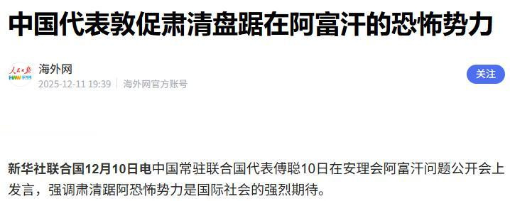 12月10日,中国常驻联合国代表傅聪大使在联合国安理会阿富汗问题会议上,代表193个国家面前,严厉谴责这两起恶性袭击事件。